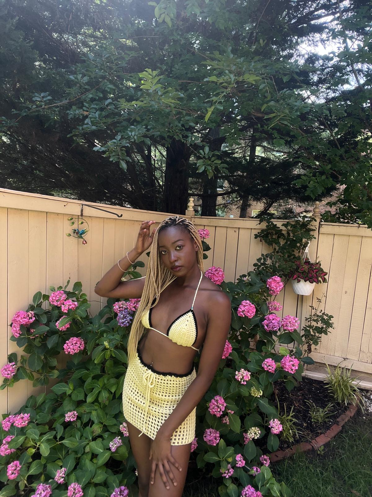 Sweet, sunny, and just a little cheeky—this hand-crocheted two-piece set features a buttery yellow triangle bikini top trimmed in black for a bold contrast, paired with a matching high-waisted mesh mini skirt with an adjustable drawstring waist.