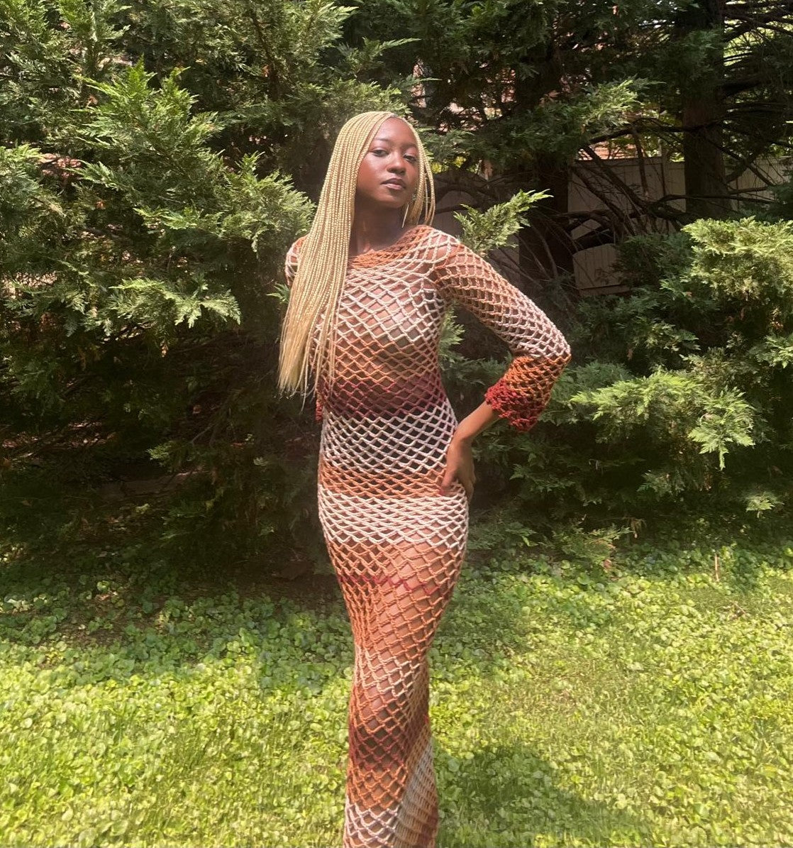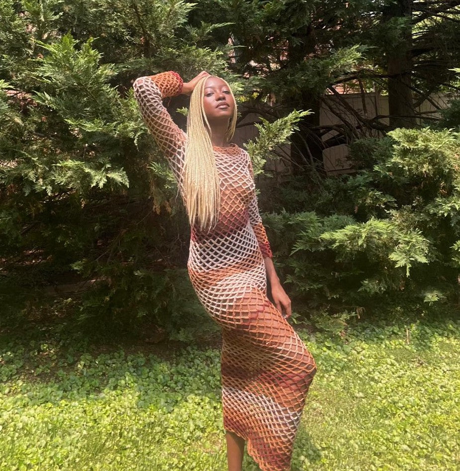 This hand-crocheted mesh dress features long sleeves and a body-skimming silhouette, it's designed to slip effortlessly over swimwear for an elevated resort look.
