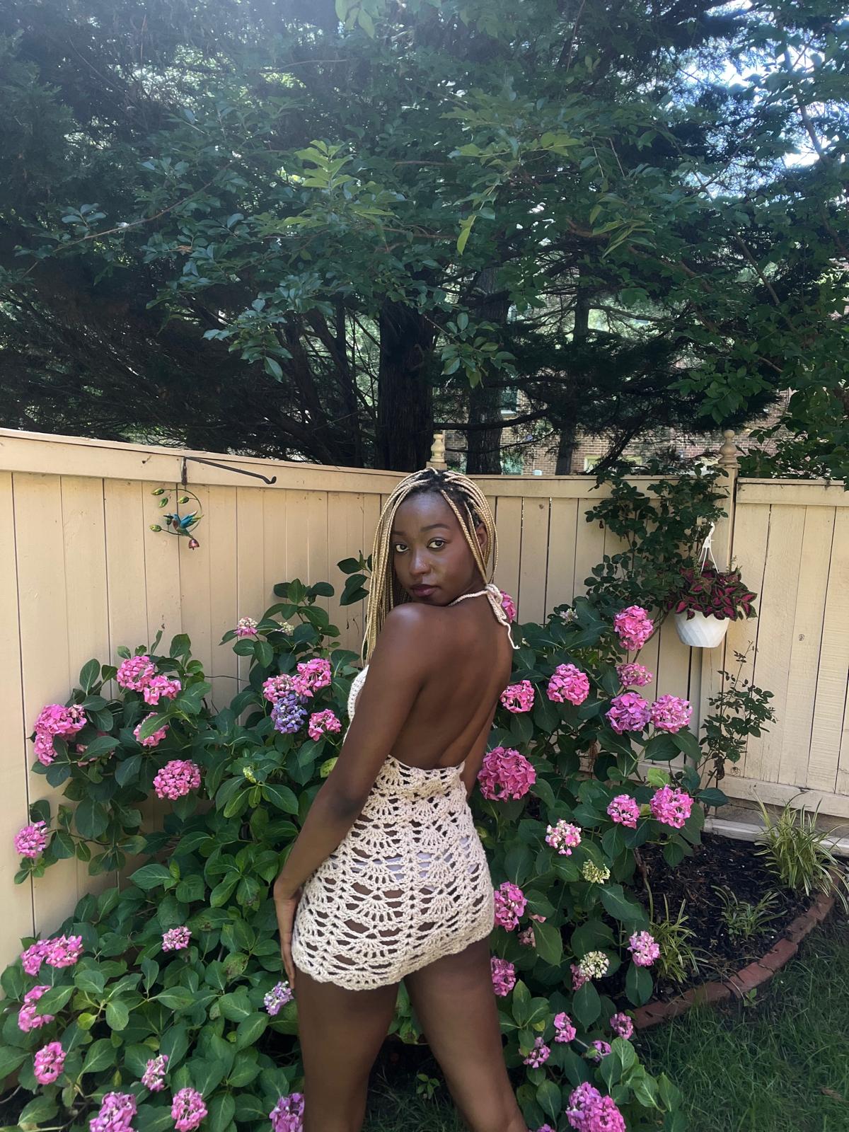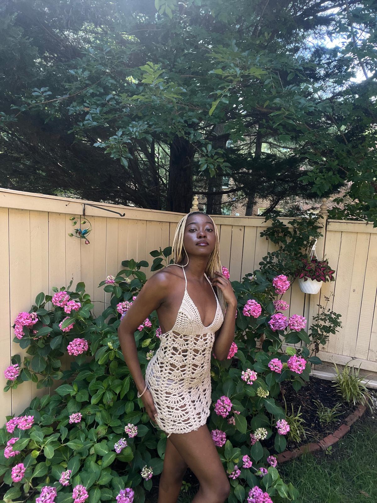 The Shell Stitch Mini is a hand-crocheted halter dress in a soft neutral tone, featuring delicate shell stitching and airy openwork. With its plunging neckline and open back, this effortlessly chic piece is perfect for layering over swimwear or styling solo for beachside brunches, pool parties, or summer nights out.